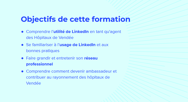 1. un séminaire-formation d’une demi-journée dédiée aux communicant.es des établissements du groupement avec un double objectif : comprendre les enjeux de LinkedIn pour une structure comme les Hôpitaux de Vendée et acquérir les clés pour contribuer à son rayonnement.
